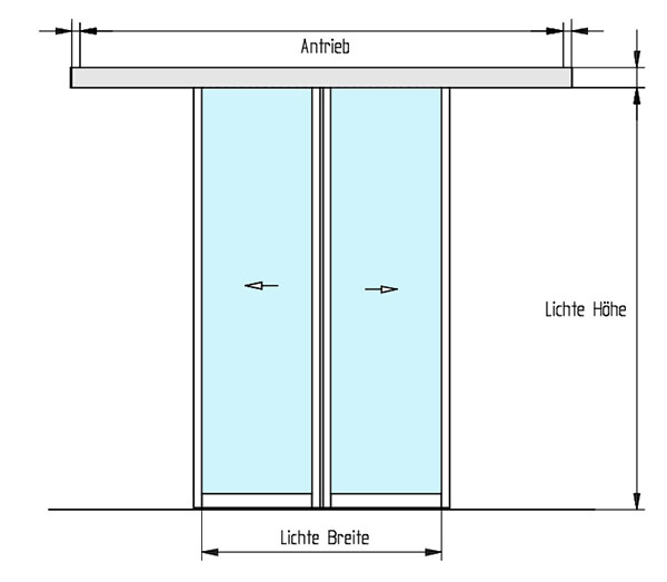 Beispiel: Zweiflüglige Schiebetüranlage Lichte Durchgangshöhe: ... mm Lichte Durchgangsbreite: ... mm Besonderheit: z.B. Farbe, Glas Art/Stärke, Fluchtwegfunktion ja/nein, etc