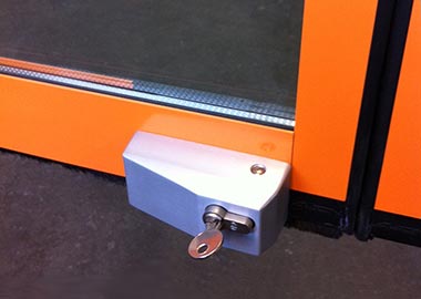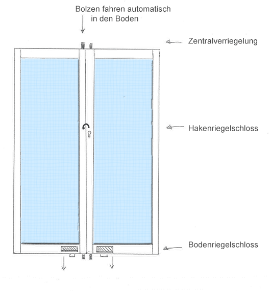 Bodenriegelschloss: Bodenschlösser können bei einer Neumontage wie auch nachträglich von Innen auf die beiden Türflügel angebracht werden. Bei Geschäftsschluss wird das Schloss manuell geschlossen und der Verriegelungsstift fährt in den Boden. Das Bodenriegelschloss kann sowohl von Innen wie von außen verschlossen werden.